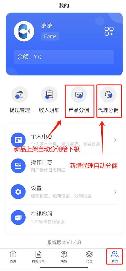 二、在“我的”点击“代理分佣”开启百分比分佣,可按照百分比抽取下级佣金,并且给下级设置佣金和上架产品。(比如你设置10%,接下来新增代理会自动上架所有产品,你会赚取10%利润)